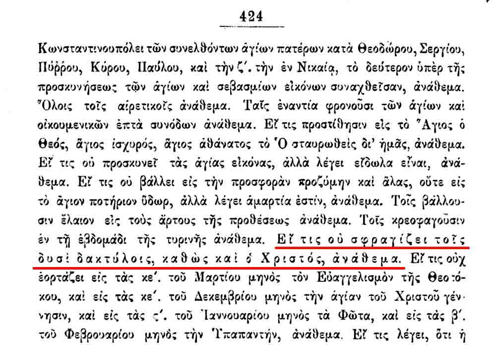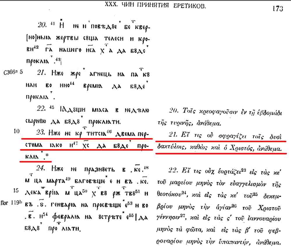 На греческом: "Εἴ τις οὐ σφραγίζει τοἳς δυσὶ δακτύλοις καθὼς καὶ ὁ Χριςτός, ἀνάθεμα" (А. А. Дмитриевский. Описание литургических рукописей, хранящихся в библиотеках Православного Востока. Tом 2: Euchologion, стр. 424).