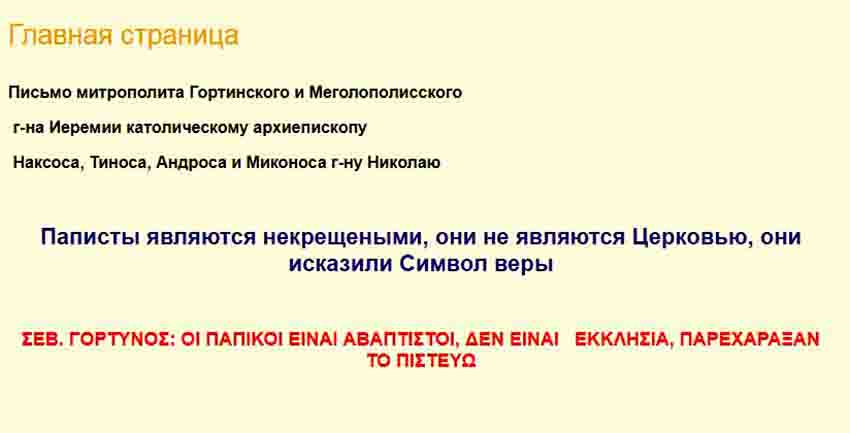 Начнем с письма митрополита гортинского, известного богослова современности, профессора афинского университета и архиерея православной церкви Эллады — Иеремии, которое он написал архиепископу-паписту Николаю (в Интернете с данным обращением можно ознакомиться по адресу: ΣΕΒ. ΓΟΡΤΥΝΟΣ: ΟΙ ΠΑΠΙΚΟΙ ΕΙΝΑΙΑΒΑΠΤΙΣΤΟΙ, ΔΕΝ ΕΙΝΑΙ ΕΚΚΛΗΣΙΑ, ΠΑΡΕΧΑΡΑΞΑΝ ΤΟ ΠΙΣΤΕΥΩ. "Паписты являются некрещеными, они не являются Церковью, они исказили Символ веры". http://apologet.spb.ru/ru/1593.html .. См. также: https://3rm.info/publications/42698-pismo-mitropolita-gortinskogo-i-megolopolisskogo.html // http://antiglobalism.blogspot.com/2014/01/blog-post_11.html#more)