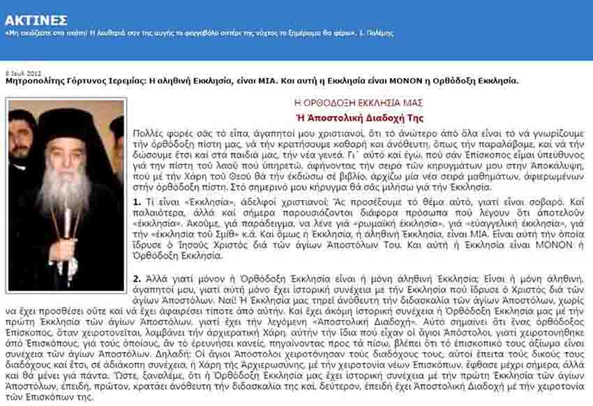 Да! Наша Церковь сохраняет чистым учение святых Апостолов, ничего не добавляя в него, ничего не убавляя в нем. И наша Православная Церковь имеет даже историческую связь с первой Церковью, потому что имеет так называемое "Апостольское преемство". ... Наиболее характерной особенностью нашей Православной Церкви являетсяполное сходство, тождественность с первой Церковью. Приведу пример: И сегодня, как и в древности, мы совершаем крещение погружением, а не кроплением, как римо-католики (паписты), в святой купели в три погружения" ((Μητροπολίτης Γόρτυνος Ιερεμίας: Η αληθινή Εκκλησία, είναι ΜΙΑ. Και αυτή ηΕκκλησία είναι μονον η Ορθόδοξη Εκκλησία) // http://apologet.spb.ru/ru/1593.html // https://3rm.info/publications/42698-pismo-mitropolita-gortinskogo-i-megolopolisskogo.html // http://antiglobalism.blogspot.com/2014/01/blog-post_11.html#more).