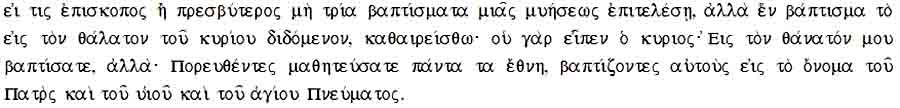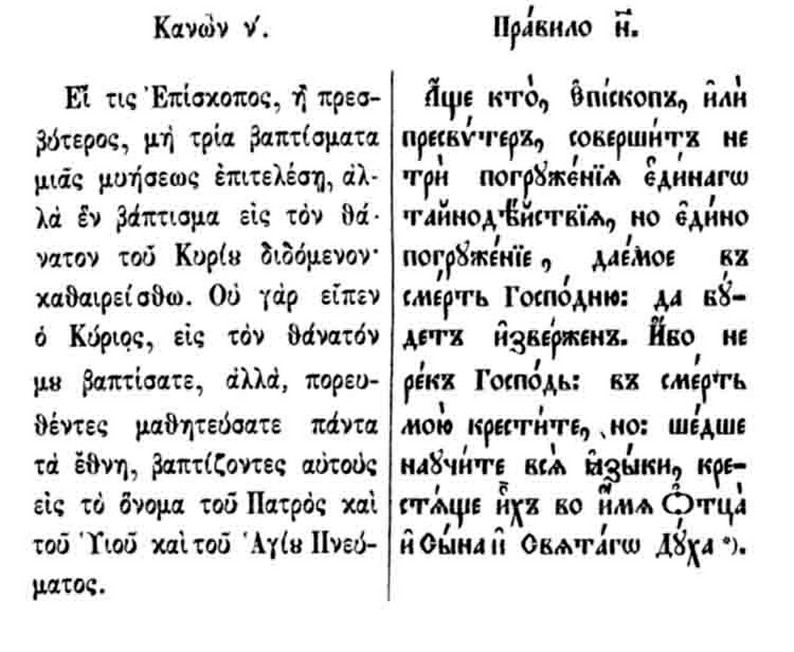 На русском: "Если кто, епископ или пресвитер, совершит не три погружения единого тайнодействия, но одно погружение, даемое в смерть Господню: да будет извержен. Ибо не рек Господь: в смерть Мою крестите, но: шедше научите все народы, крестя их во имя Отца, и Сына и Святого Духа".