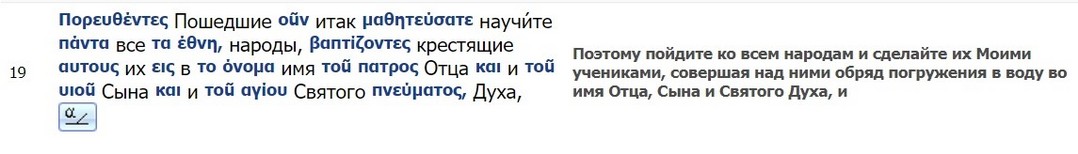 Др. Греч.: Πορευθέντες οũν მαθητεύσατε πάντα τα έθνη, βαπτίζοντες αυτους εις το όνοმα τοũ πατρος και τοũ υιοũκαι τοũ αγίου πνεύმατος (Мф. 28:19).