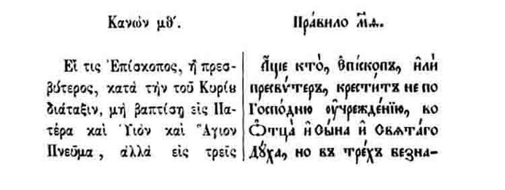 "Если епископ или пресвитер вопреки установлению Господа крестит не во имя Отца и Сына и Святаго Духа (Мф. 28:19), но во имя трех безначальных, или трех сынов, или трех утешителей, то да будет извержен" (См. Пидалион. Правила Православной Церкви с толкованиями. Том 1. Правила Святых Апостолов. Александро-Невский Ново-Тихвинский женский монастырь. Екатеринбург. 2019 г. 291 // См. также: https://azbyka.ru/otechnik/Nikodim_Svjatogorets/pidalion-pravila-pravoslavnoj-tserkvi-s-tolkovanijami-tom-1-pravila-svjatyh-apostolov/4_50).
