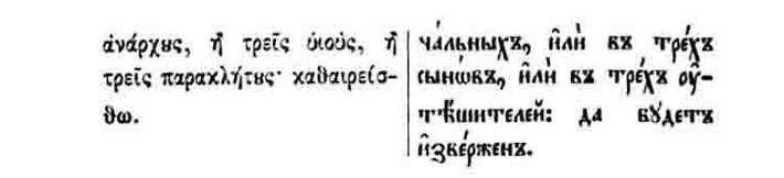 В частности, «крестящих однократным погружением евномиан, а также савелиан и фригийцев принимаем, как еретиков». Пояснение: «данные еретики крестятся единым погружением, в отличии от православных, крестящихся троекратным погружением; поэтому, если они присоединяются к православной Церкви, то и принимаются, как еретики…». Рядом с текстом на свободном поле имеется замечание: ("Иже единем погружением крещающеся, евномиане, и савелиане, и фриги, яко еллини прияти будут. Толкование. И тии еретицы суть, единем погружением крещаются, а не треми, якоже православнии; сии же аще приступят к соборней церкви, яко же погании прияти будут, и прежде крещения, время довольно поучаются и божественных писаний да послушают, и потом совершенно крещаеми бывают. На поле: крещение не в три погружения не крещение" (Кормчая (Номоканон). Отпечатана с подлинника патриарха Иосифа. Репринтное издание. Санкт-Петербург., гл. 11, втораго всел. собора правило 8, л. 88-88 об. (стр. 309-310)).